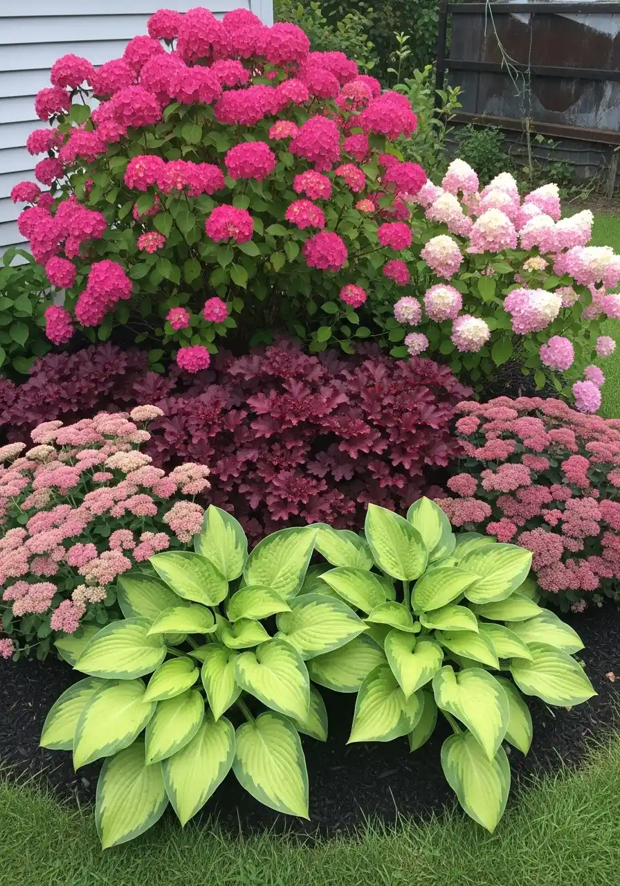 This setup is my weakness, for real. That hot pink hydrangea look is loud in the best way, and it makes the whole corner feel alive. For alaska landscaping ideas, I like how it uses layers: tall flowers in back, medium “purple leaf” plants in the middle, and big lime-green hostas up front. It’s not just pretty, it’s organized. And yes, I’m jealous because it looks like somebody planned it, unlike my chaos beds.