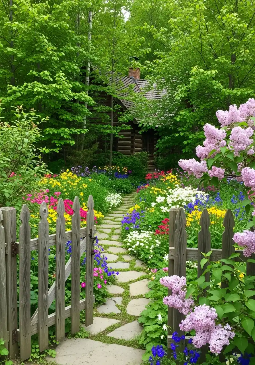 Woodland gate path with lilacs and “cabin garden” vibes