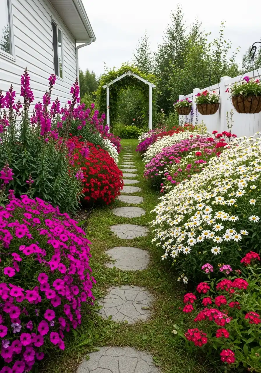 For Alaska landscaping design ideas, the big win here is using repetition. The stepping stones repeat, the flower mounds repeat, and your eyes relax because it makes sense. I’d plant tall stuff near the house (snapdragon-style spikes or hardy foxglove types) and keep lower mounds near the stones so they don’t flop into your feet. Hanging baskets are a cheat code in Alaska because you can use fast annuals up high while perennials fill the ground. Just remember baskets dry out quicker, so water them more, even when it’s cool.