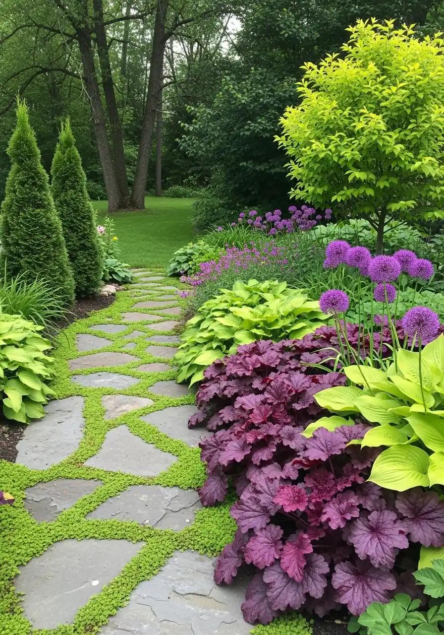 This design is the “quiet luxury” of alaska landscaping ideas. It’s mostly greens and purples, with smooth curves that guide you forward. The hostas are fat and healthy, the burgundy leaves (heuchera again) give depth, and those purple allium balls add drama without being messy. It’s calming. I’d sit here and pretend I’m a responsible adult who drinks tea and prunes things.
