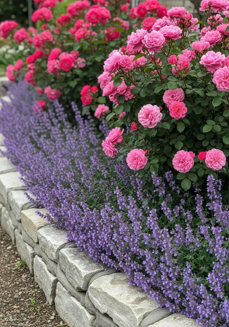 Here’s the hack: the purple border does a ton of work. Catmint is common in photos like this, but in colder areas you can use other hardy purple bloomers or even a tough groundcover that flowers. The goal is to soften the stone and make the roses look even brighter. I swear, pink looks pinker next to purple.