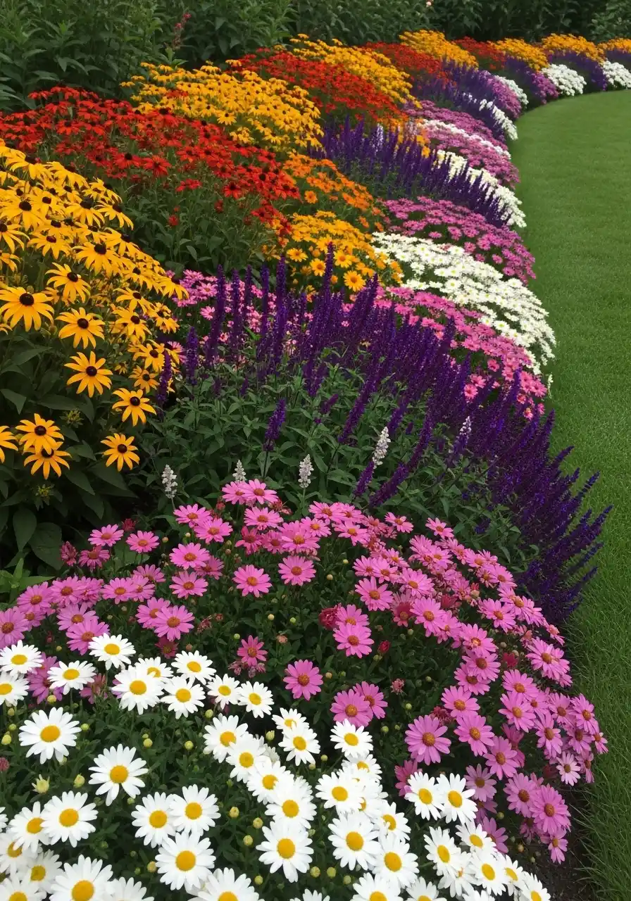 A long “rainbow border” along the lawn for nonstop color