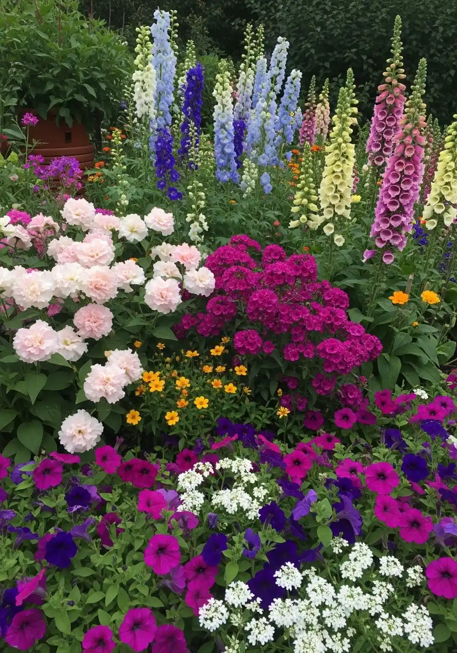 A mixed cottage bed with tall spires and bright filler flowers