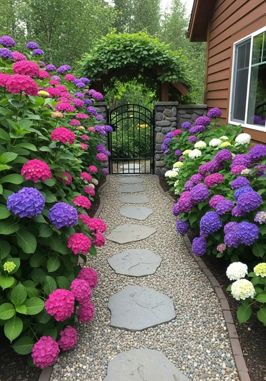A hydrangea tunnel path to a gate (big impact, simple plan)