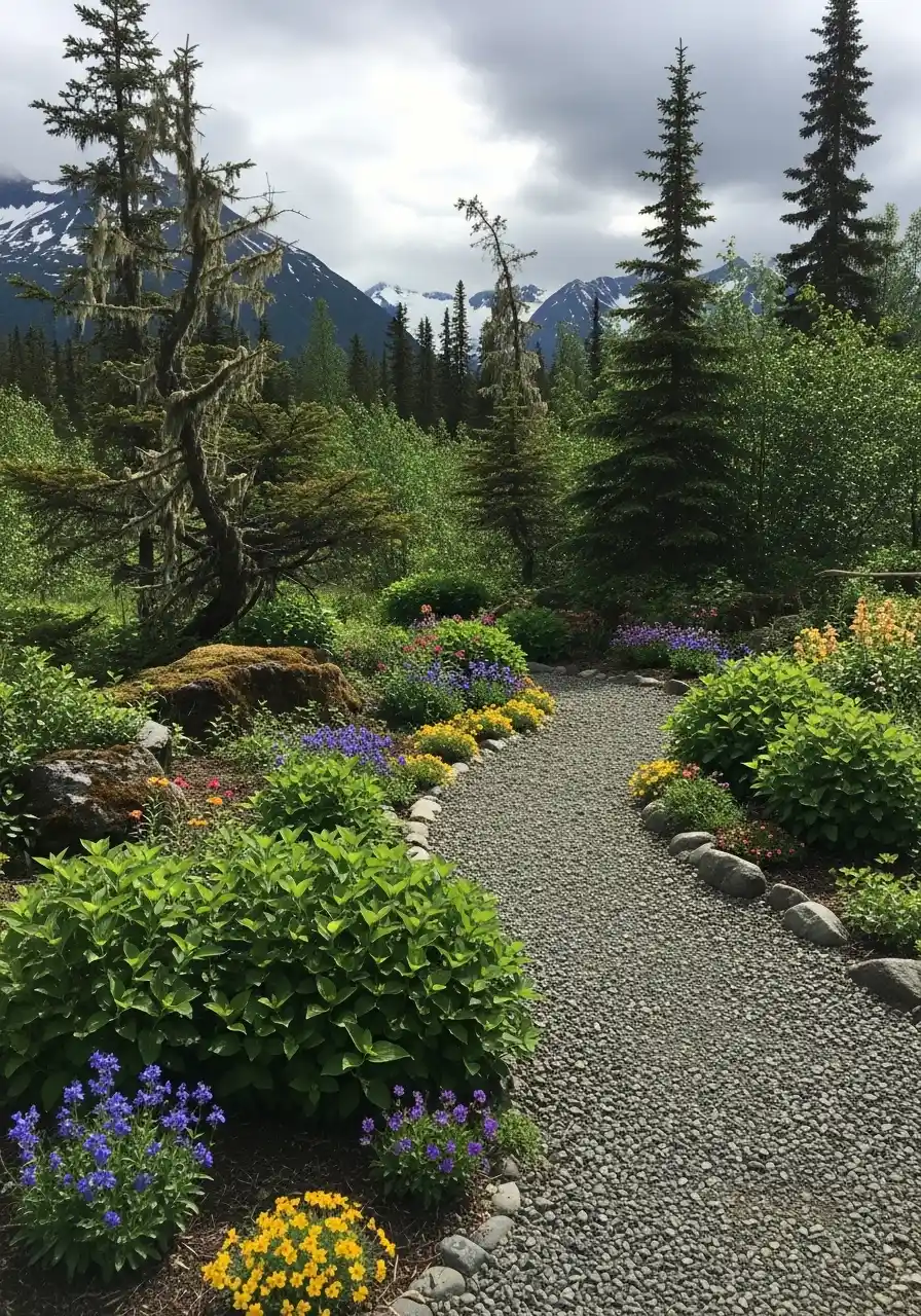 I like how the path curves and disappears. It makes you want to walk it. If you want this as part of your alaska landscaping ideas list, keep maintenance simple: refresh gravel when needed, pull weeds early, and don’t over-water. In cooler climates, soggy soil can be worse than dry soil, and I learned that the sad way.