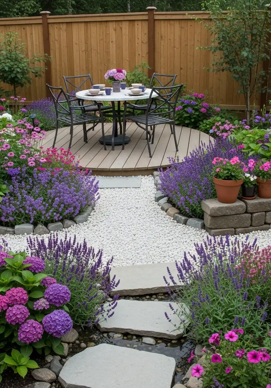 A patio “room” with gravel, stepping stones, and soft purple edges