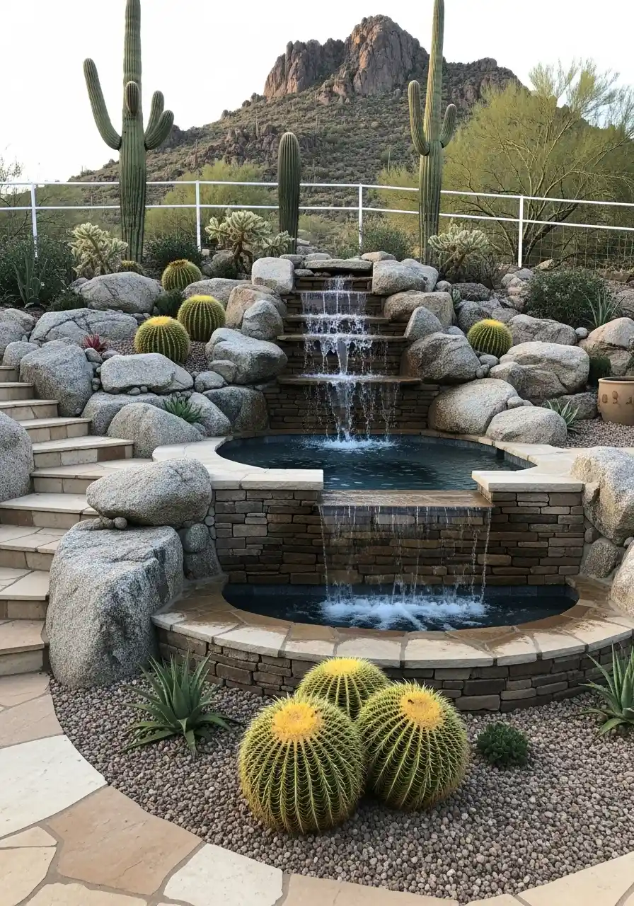 One of the best ways to add serenity to your Arizona pool landscaping ideas is by incorporating a water feature. Whether it’s a cascading waterfall, a flowing stream, or a simple fountain, the sound of trickling water has an almost magical effect on your backyard. Water features can serve as both functional and decorative elements in your pool design.