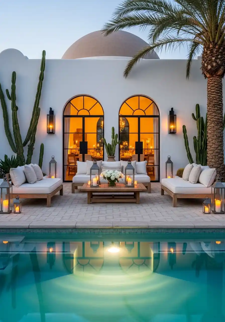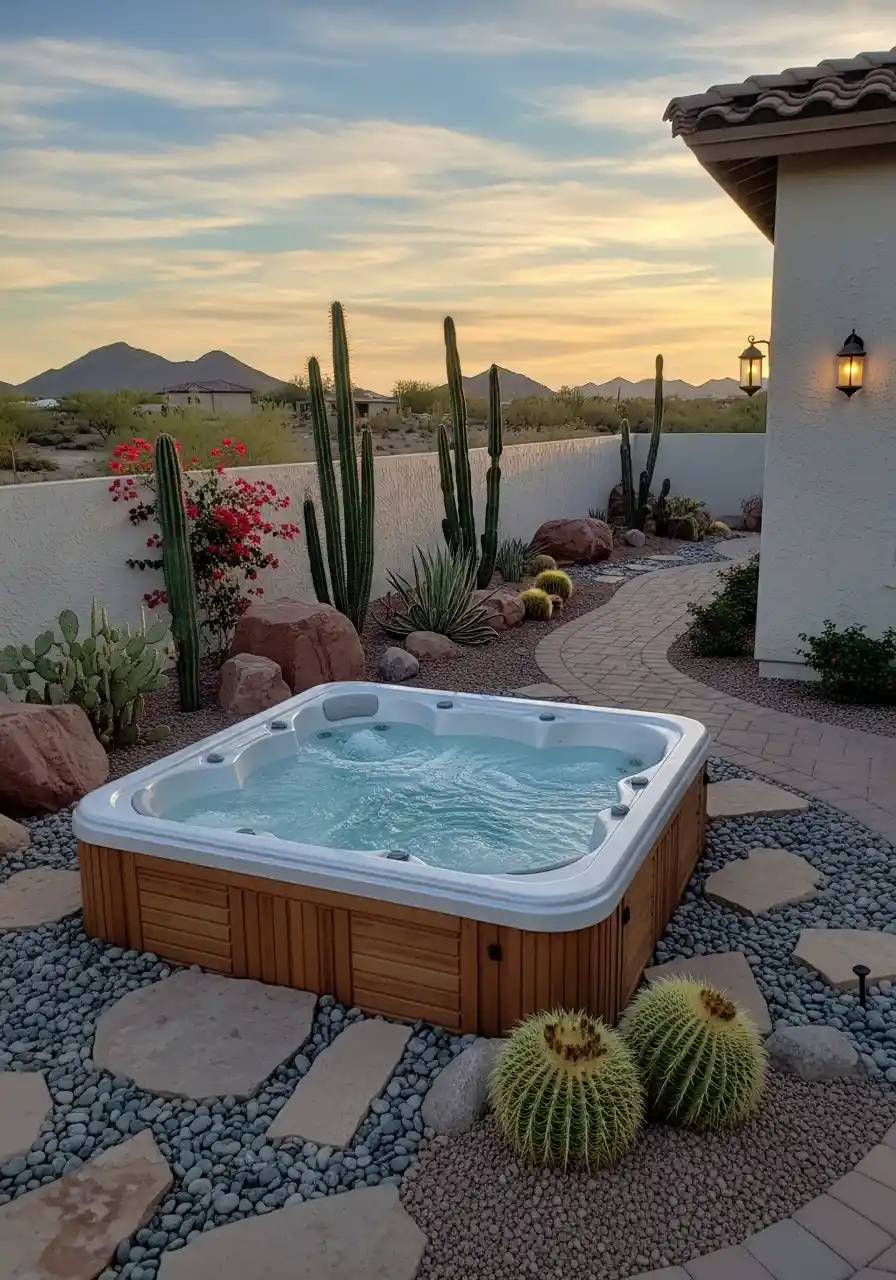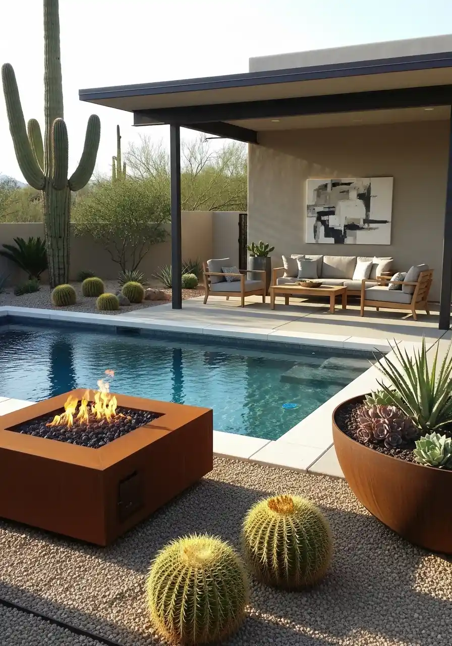 Pro Tip: For a more personal touch, add ambient lighting around the pool and seating area. LED lights can highlight the cacti and fire pit, creating a soft, glowing effect that enhances the atmosphere as the sun sets.