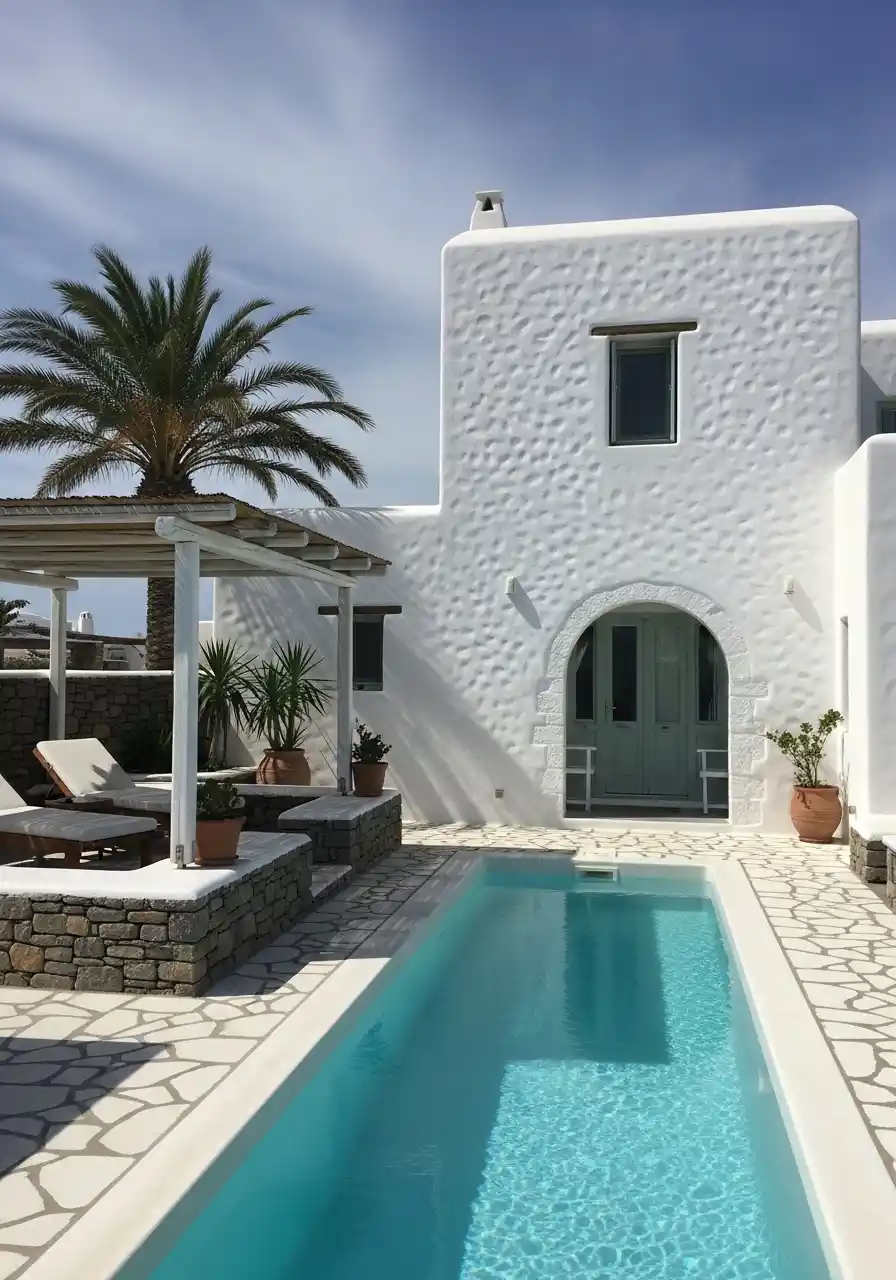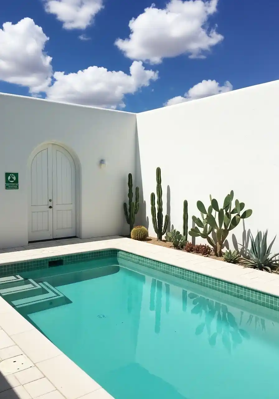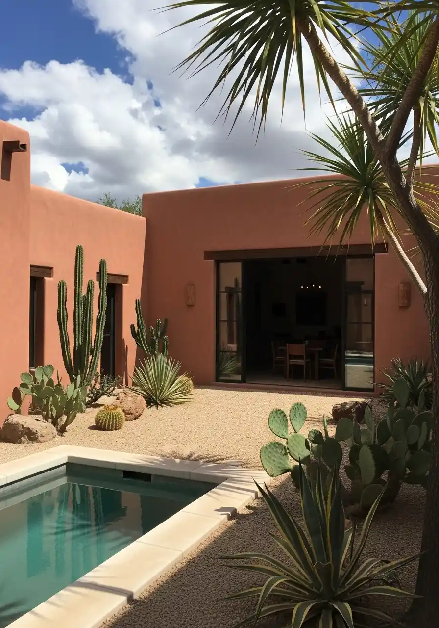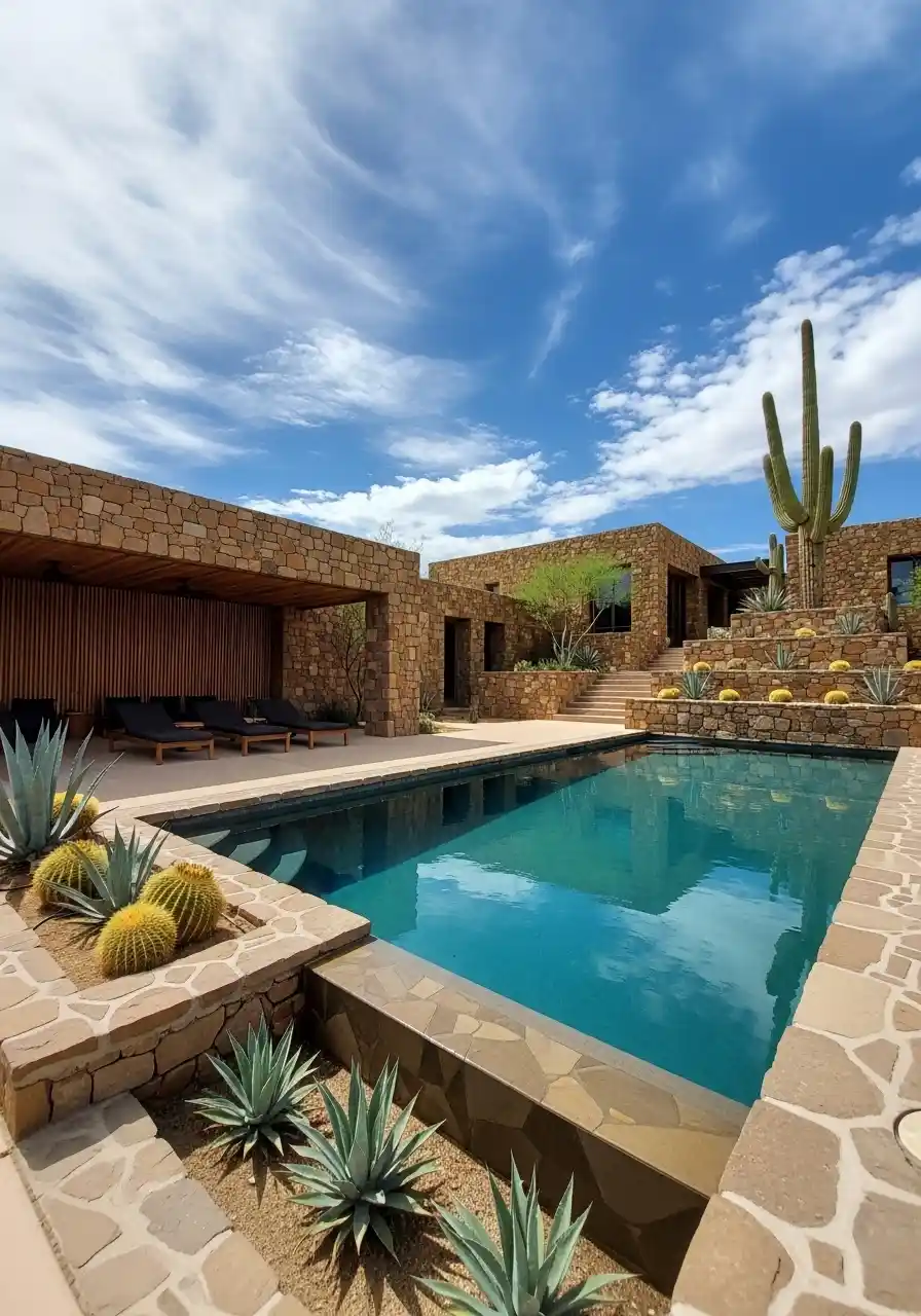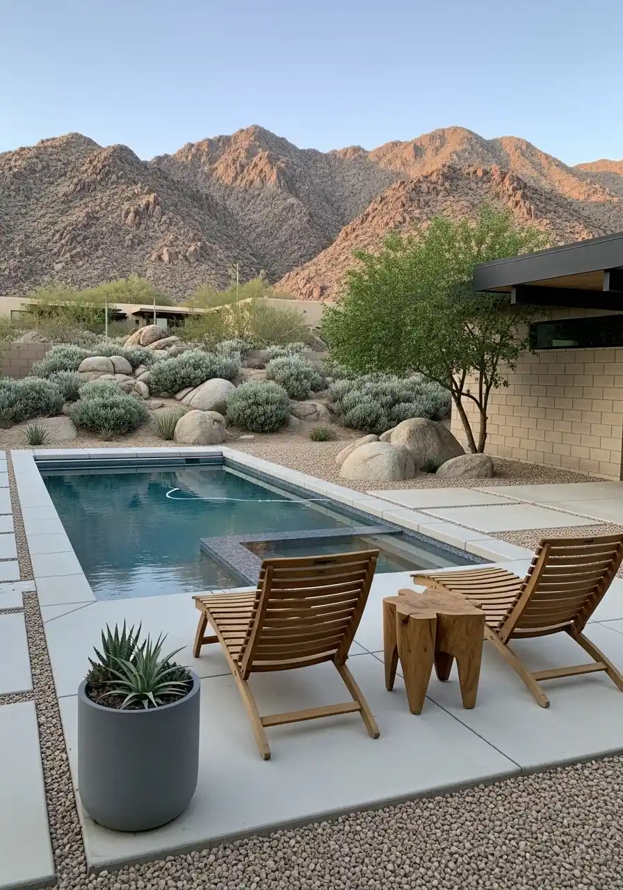 The addition of desert-friendly plants like aloe vera and small succulents around the pool gives the space a sense of harmony without over-cluttering it. The key to this design is to keep things simple yet stylish.