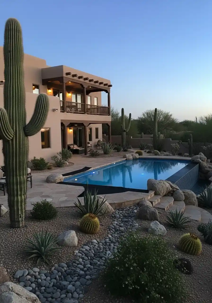 Start by planting taller cacti or agave near the pool’s edges, while filling in the gaps with smaller succulents or ornamental grasses. Adding rocks or boulders to the mix enhances the natural desert vibe and helps to create different levels in the landscape. This not only adds dimension to your backyard but also gives it a well-balanced, textured feel.