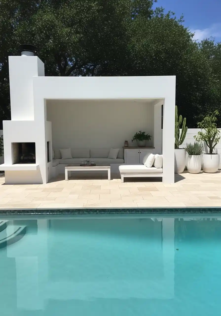 Set up a bar area with stools and an outdoor kitchen complete with a grill, counter space, and storage for your cooking essentials. Consider adding a small refrigerator for beverages, or even a fire pit for added warmth when the evening cools down. This outdoor kitchen area can be surrounded by beautiful desert plants, such as agave or yucca, to keep the atmosphere in line with your poolside oasis.