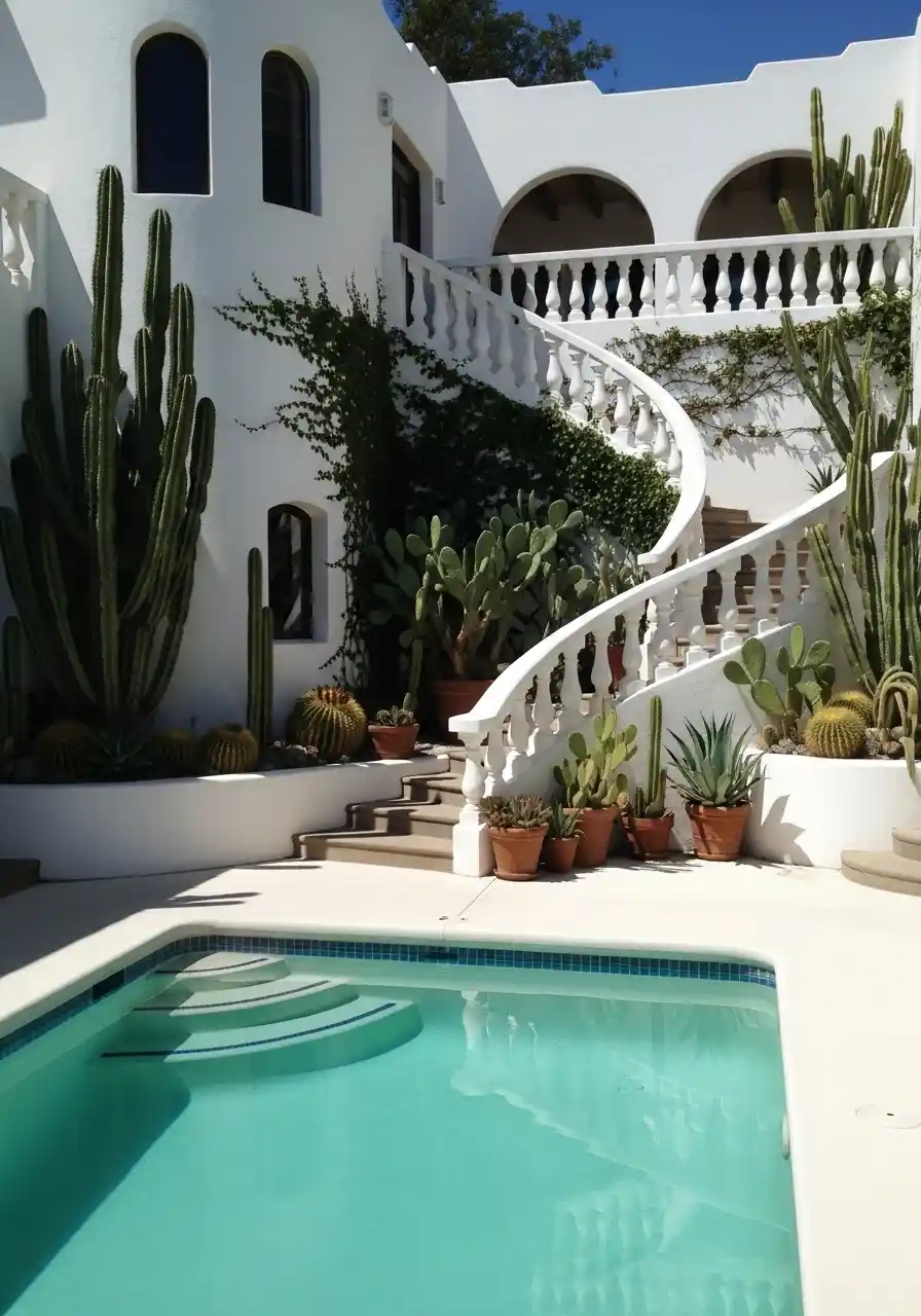 If you want to bring the desert inside your pool area, opt for plants that thrive in hot, dry climates. The key is to use a variety of sizes and shapes to create visual interest. Tall cacti and spiky succulents add texture, while smaller ground-covering plants fill in the space without overwhelming the area.