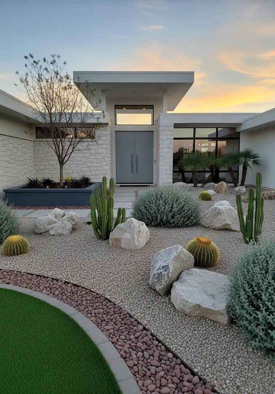 The white stone surrounding the plants and path makes everything pop, while the soft lighting gives off a serene, almost mystical vibe. For anyone looking for a more contemporary and sleek aesthetic with a bit of flair, this Arizona rock landscaping idea is an absolute win. It’s simple, stylish, and very practical. You could easily replicate this look using materials available locally, making it both affordable and unique.