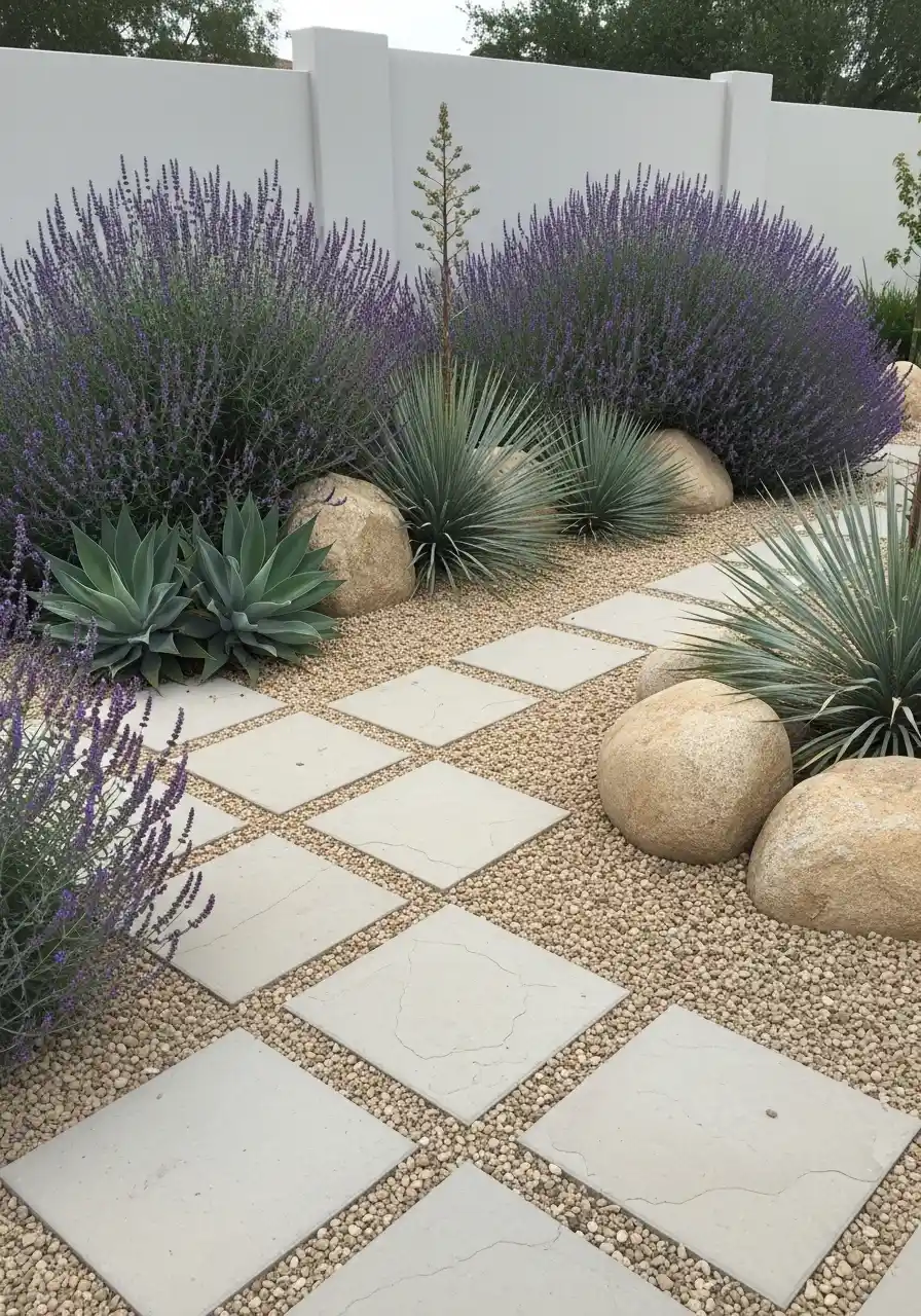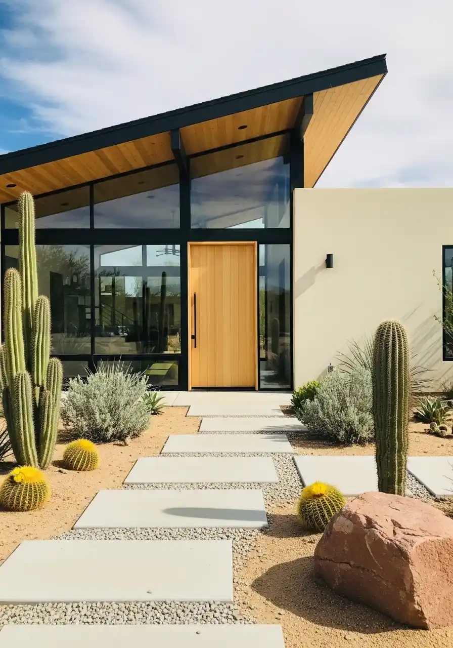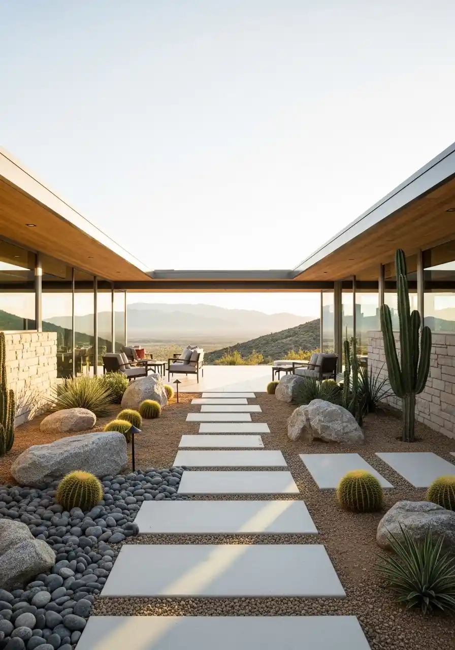 For those who enjoy a more natural and relaxed look, this design hits all the right notes. The combination of smooth, flat stepping stones surrounded by gravel and accented by lush, spiky desert plants gives a beautifully organic vibe. The natural-looking rock garden filled with various cacti and succulents is complemented by the smooth lines of the stepping stones, guiding you through a serene landscape.