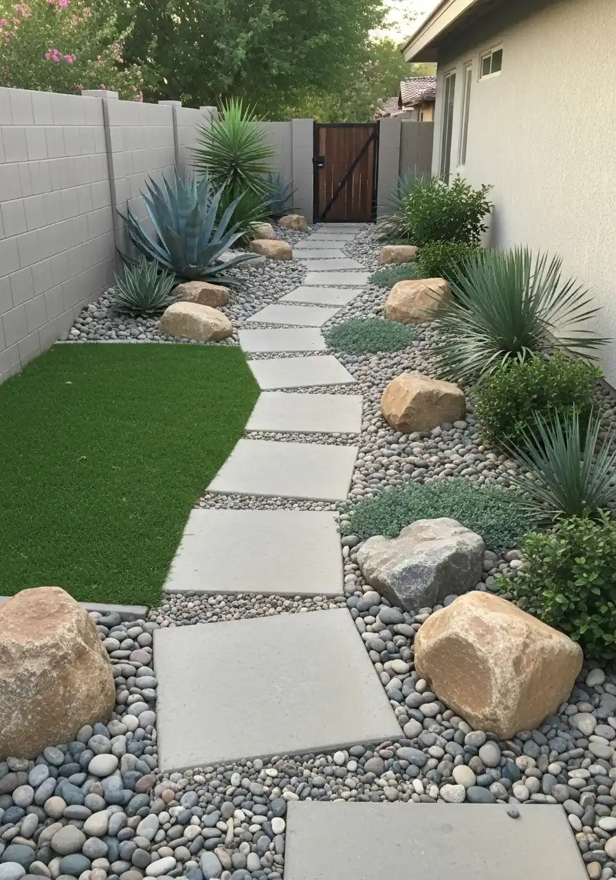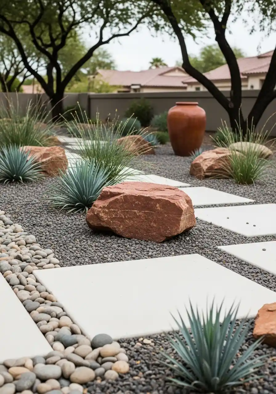 The key to this design is the combination of different textures. The contrast between the fine pebbles and larger stones helps create visual interest, while the greenery adds softness. If you’re not into a lot of upkeep, opt for plants like agave or aloe vera. These desert-friendly plants thrive in dry conditions and blend well with Arizona rocks, creating a luxurious yet natural setting.