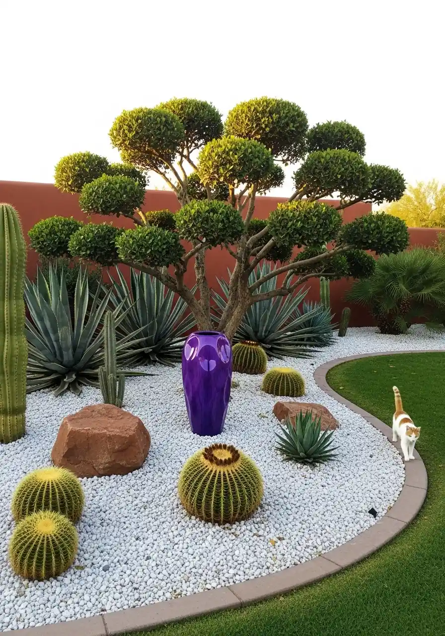 This design features large, natural stones in earthy tones that complement the color palette of the surrounding desert plants. The warm hues of the Arizona rocks blend beautifully with the vibrant greens and yellows of the cactus and succulent plants. It creates a lively yet grounded atmosphere that exudes a rustic desert charm. The addition of a colorful ceramic vase in the center adds a playful touch and creates a focal point in the landscape.
