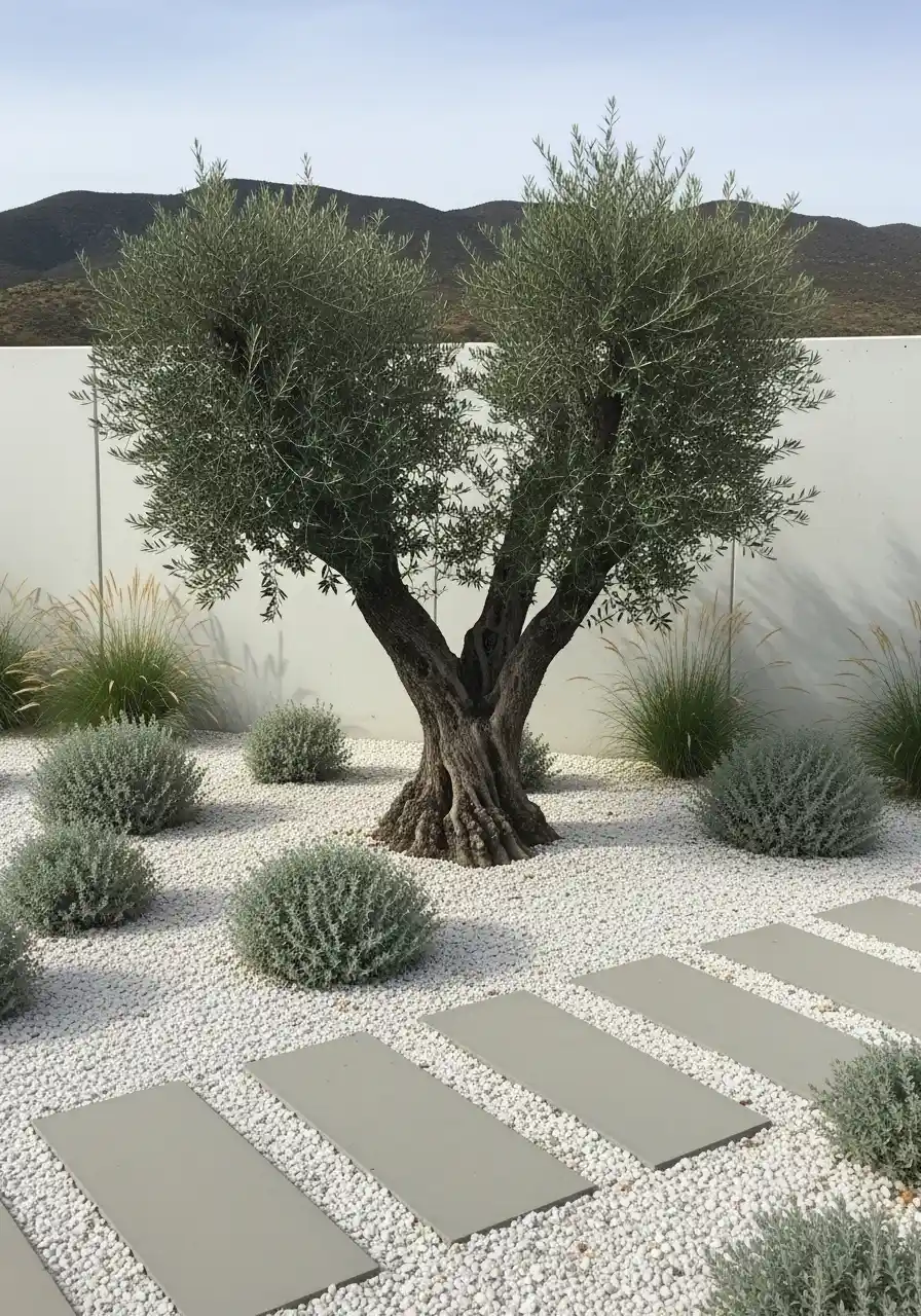 If you’re someone who loves a tranquil atmosphere, the design idea might be just what you need! This idea uses gravel, large stones, and a single olive tree to create a Zen-like garden. The clean, simple paths help guide you through the garden, while the soft gravel and neatly placed rocks offer a calming, peaceful vibe. The olive tree in the middle adds an element of balance, acting as both a focal point and a symbol of strength.