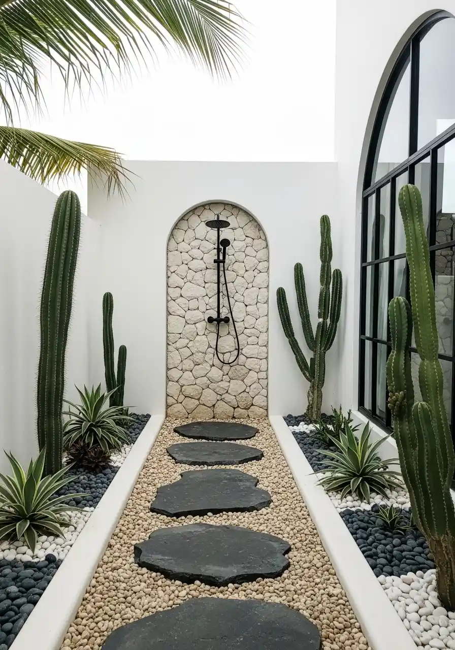 Finally, the idea showcases a modern take on the classic cactus garden, with bold rocks, smooth gravel paths, and tall, striking cacti standing tall as focal points. This design is all about the power of the cactus! The clean lines of the path and the large stones create a strong base that allows the cacti to stand out in all their glory.