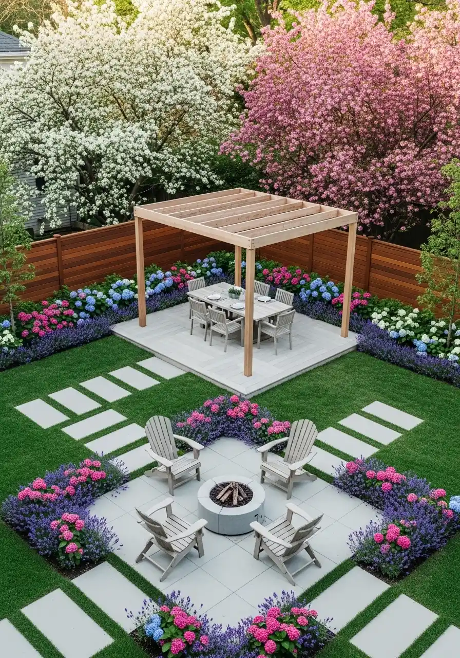 This one feels like you can do a whole day outside without moving much. There’s a pergola over a dining table, then a clean stepping-stone path, then a round firepit area. I like how the path is straight and predictable, so your eyes don’t get tired. It’s one of those backyard landscaping designs that makes the yard feel longer, even if it’s not.