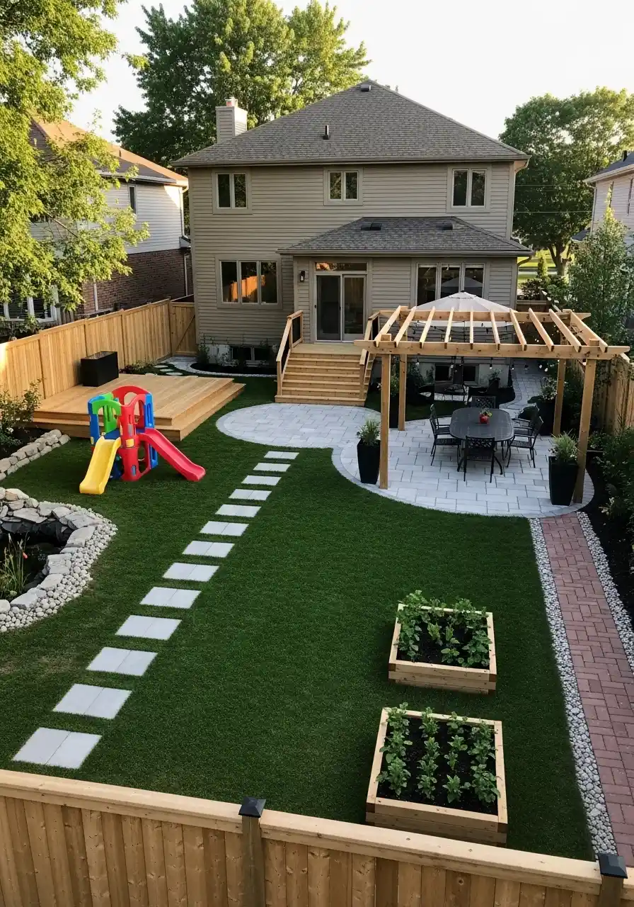 This yard looks like it actually gets used, not just photographed. There’s a pergola dining space, a kids play area, a little deck, and still a clean lawn. It’s divided but it doesn’t feel chopped up. That’s the sweet spot for backyard landscaping designs in regular neighborhood yards.