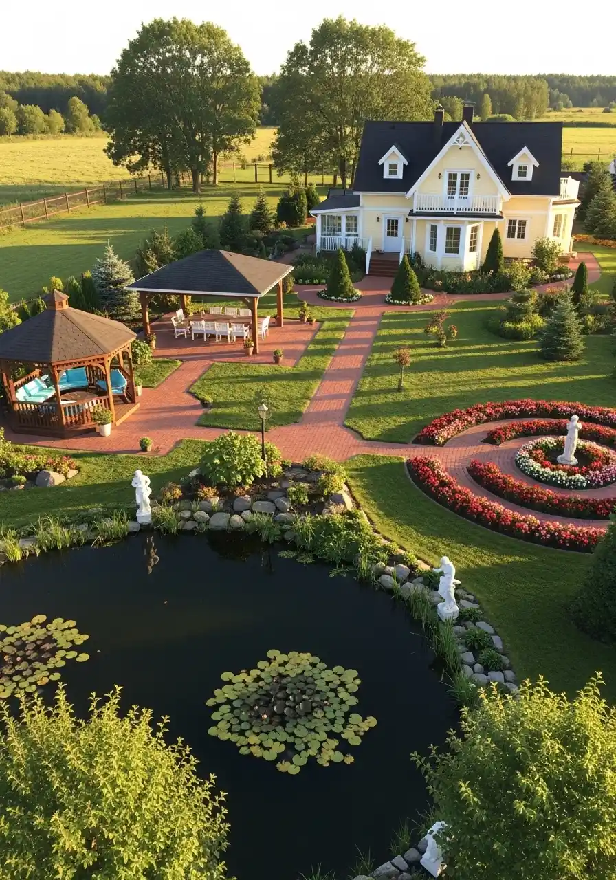 Backyard landscaping designs that feel like a full estate with ponds and brick paths