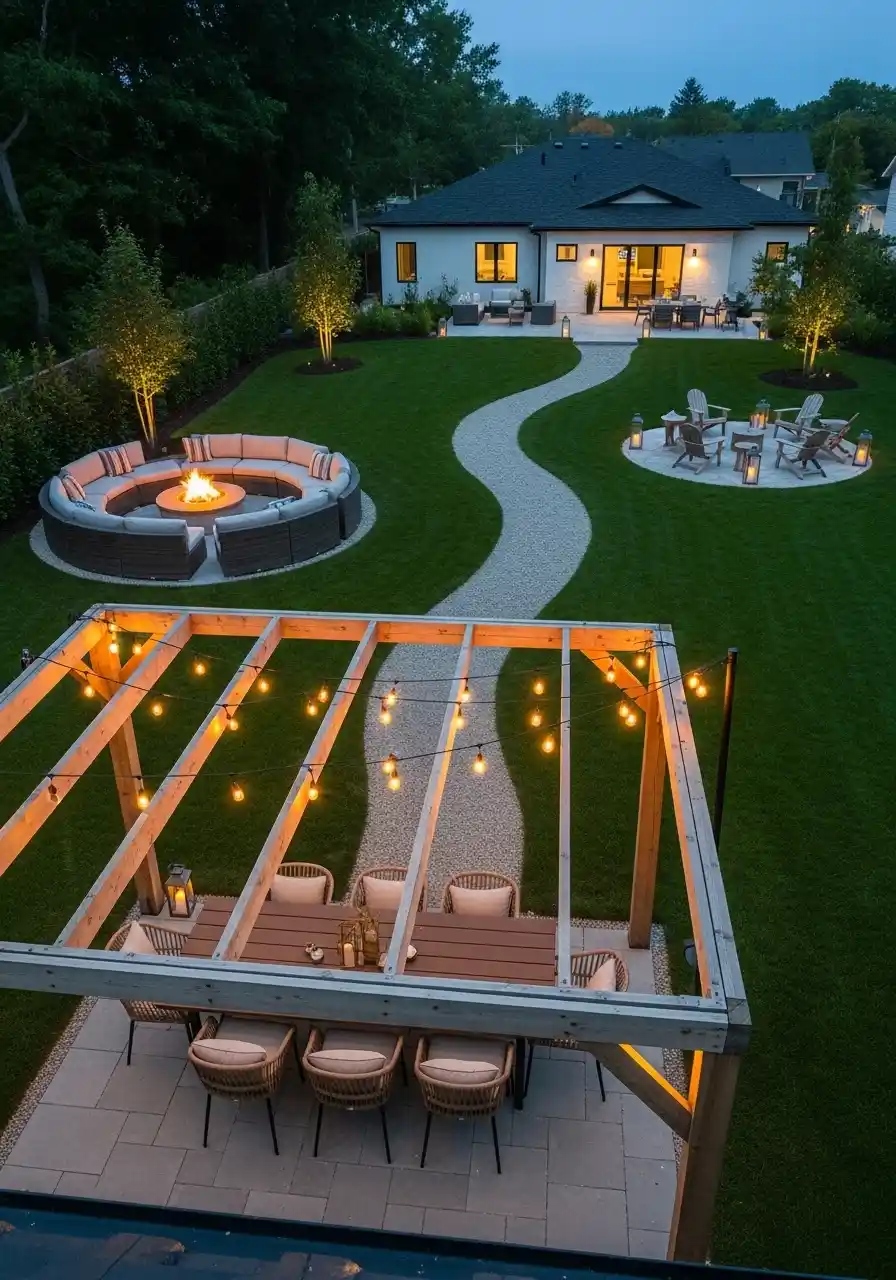The pergola dining lane + firepit circle (the “weekend at home” plan)