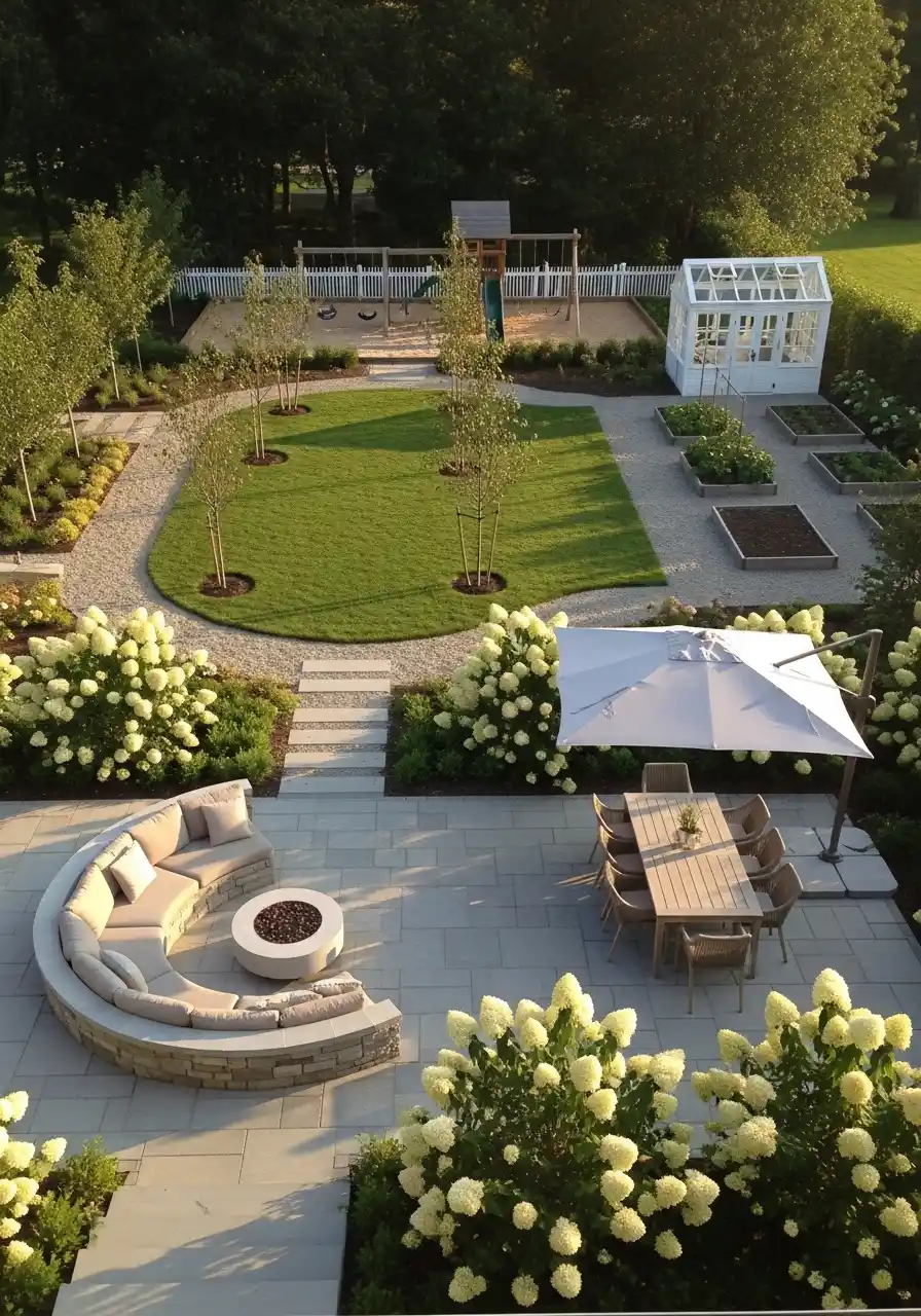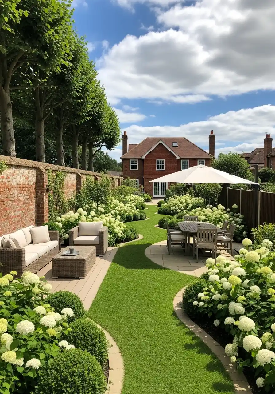 This one is all about curves. The lawn flows like a ribbon, and the flower beds are stuffed with big white hydrangeas and round shrubs. It looks calm, like the yard is telling you to lower your shoulders and breathe. I’m not even a “perfect garden” person, but this backyard landscaping design is hard to hate.