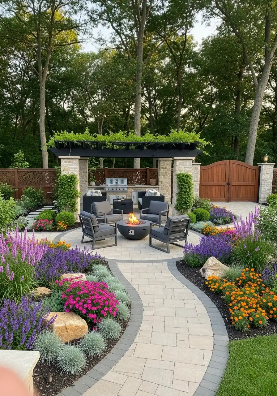This design uses a curved paver path and big, happy flower beds to guide you to a firepit lounge area. It’s like the yard has a storyline. I love that, because some backyard landscaping designs look nice but feel random. This one has a clear “go here” energy.