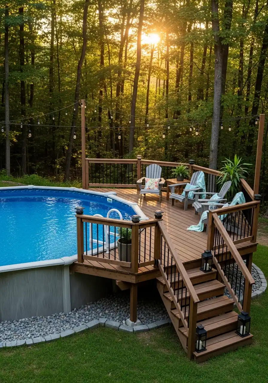 If you’re doing backyard pool landscaping with an above-ground pool, commit to the deck. A simple ladder on the grass always looks unfinished. Add a gravel border or stone edge under the deck to stop mud splashes. And add a few planters so it doesn’t look bare. Also, string lights are a cheat code. They make almost any pool setup feel better, even if the furniture isn’t perfect.
