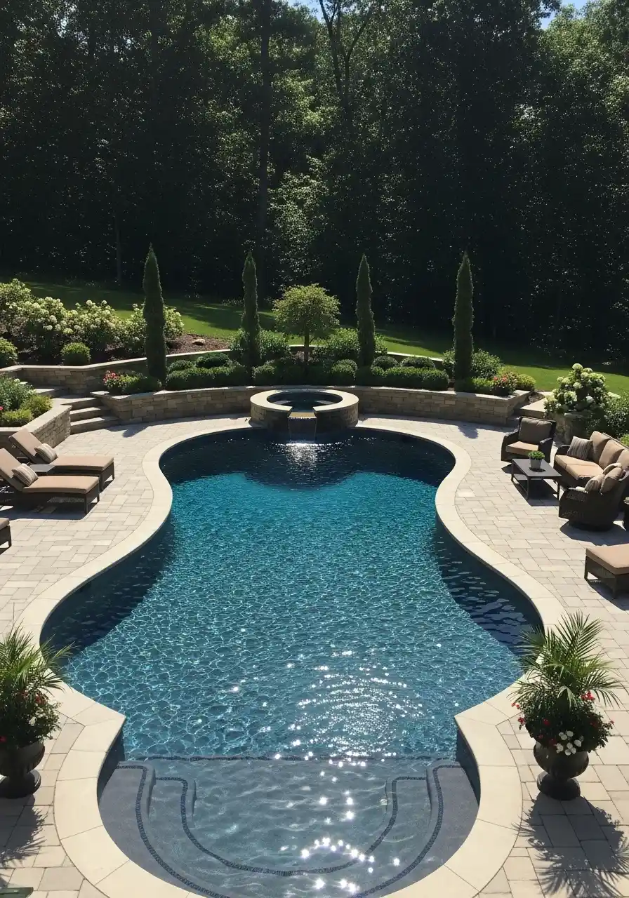 This pool has that smooth, curvy shape that instantly feels softer than a sharp rectangle. And the raised spa and little spillover fountain at the far end? It’s like the pool is wearing jewelry. I like how the stone pavers wrap around with a clean border, so the water shape looks crisp instead of messy.