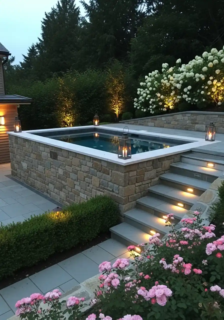 This one is moody in the best way. The raised pool (or spa) with stone sides feels like a little private retreat, and the step lighting makes everything feel safe and expensive at the same time. I seriously love lighting in swimming pool landscaping, because it changes the whole mood without changing the layout.