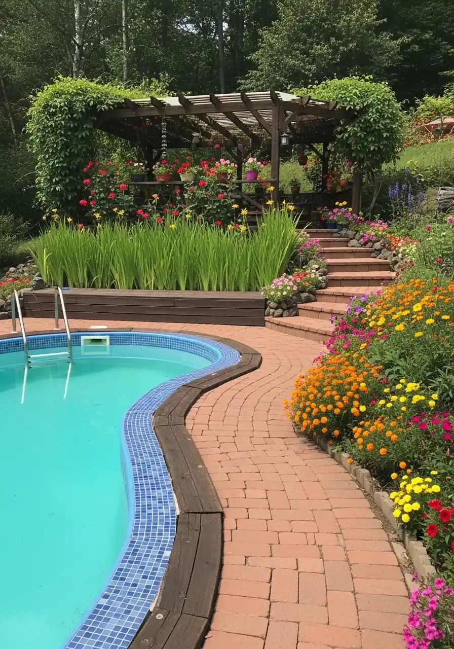 This is the one that feels like a storybook yard, in a good way. The pool has that rounded edge, and the brick paver path curves with it, so your eye just keeps moving. Then you hit the pergola area packed with flowers, pots, and climbing plants, and it feels like a garden room.