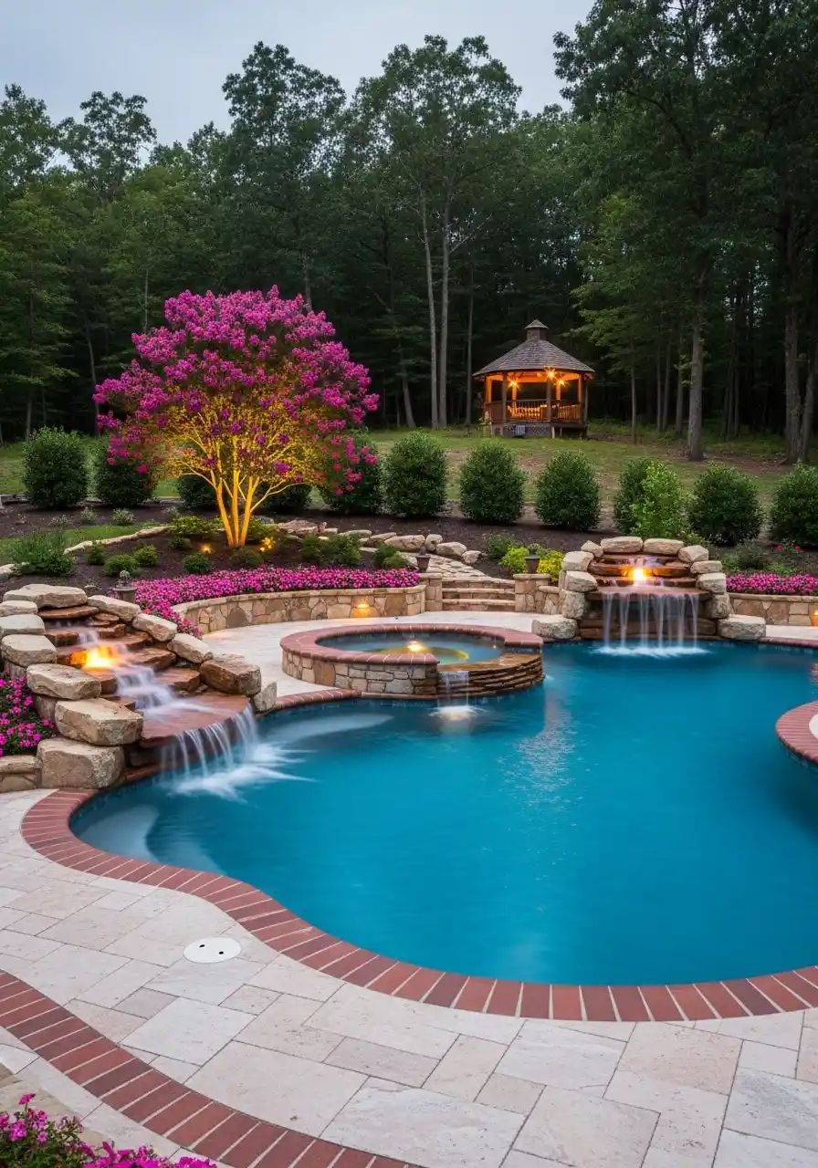 For backyard pool landscaping, the big lesson here is creating “destinations.” You’ve got the pool deck, the spa area, the waterfall edge, and then the gazebo hangout. It gives everyone a spot, so it doesn’t feel like everybody is piled on top of each other.