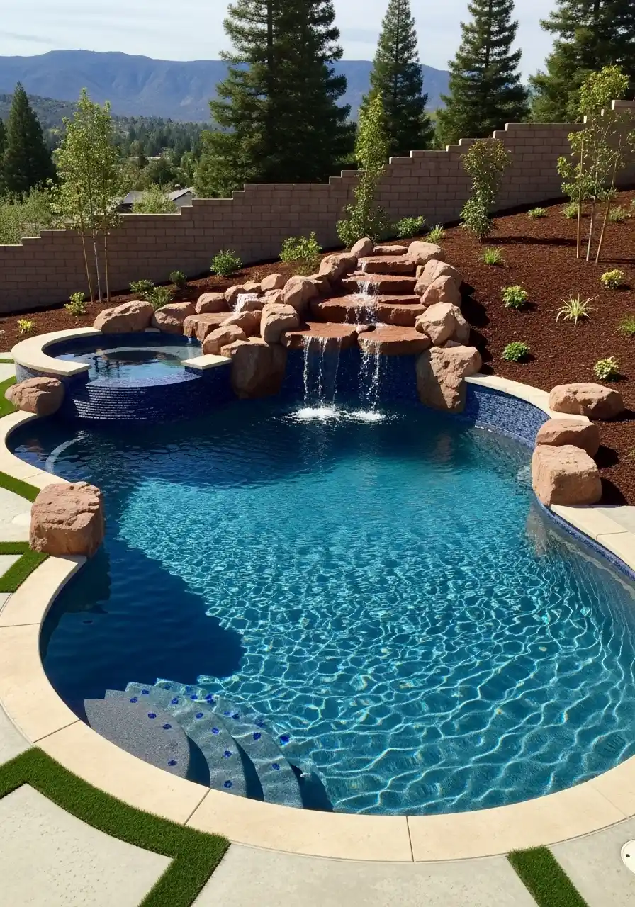 Backyard pool landscaping with a rock waterfall and slide play zone