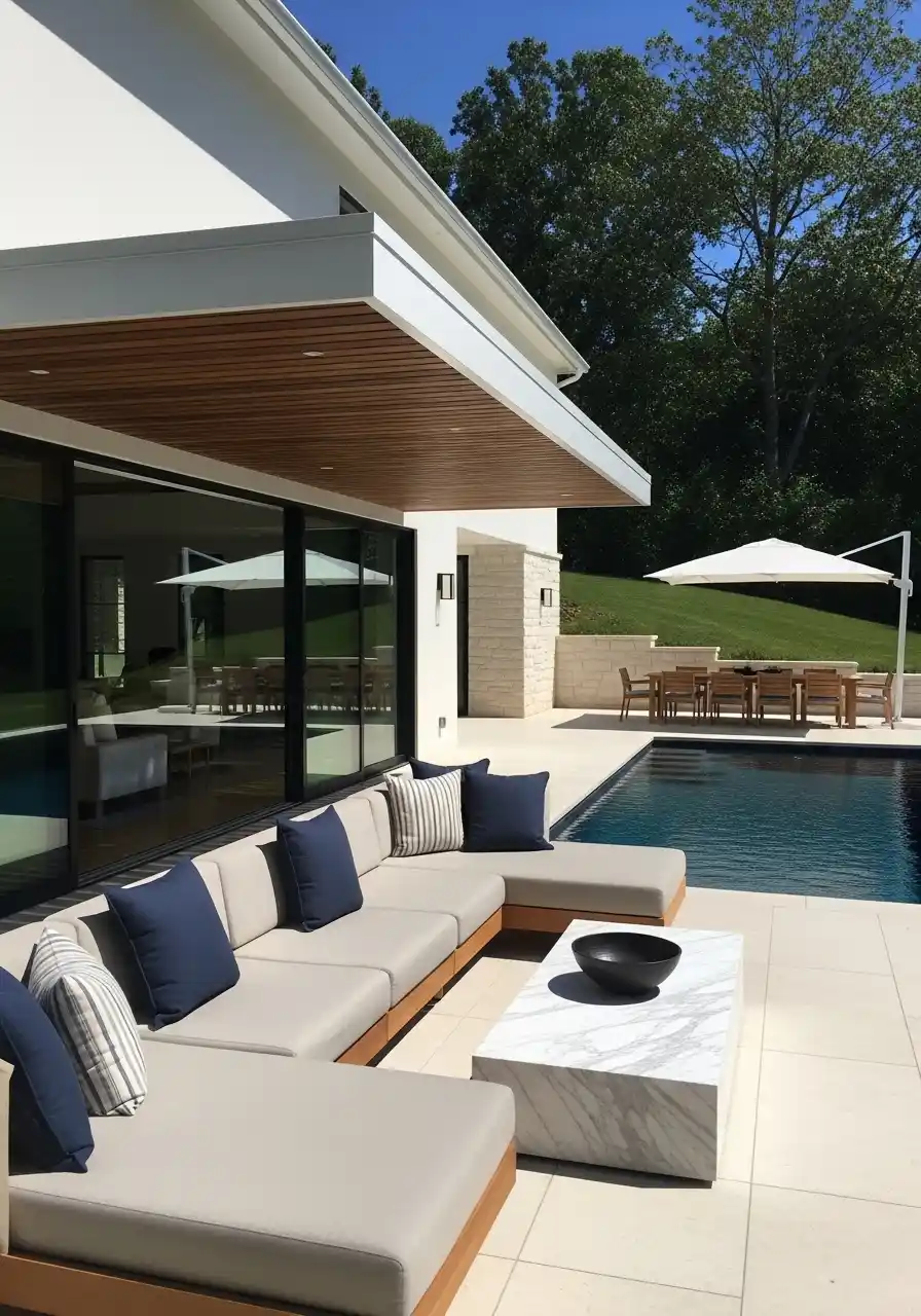This is for people who hate clutter. Big pale pavers, straight lines, simple furniture, and that long modern roofline. It feels quiet and clean, like your brain can finally stop buzzing. I love how the sectional faces the pool but still feels like its own “room” with the coffee table centered.