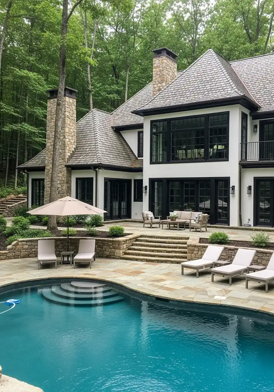 This one feels like a magazine shoot. The stone retaining walls, the clean patio levels, and the way the loungers sit like they belong there… it’s calm and expensive-looking. I like how the stairs are wide and centered, because it makes the whole pool zone feel planned, not random.