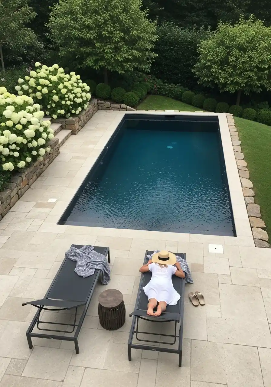 If you want backyard pool landscaping with this clean look, keep your furniture simple. Black loungers or neutral tones work best, and don’t over-decorate. My trick here is using one “main plant” and repeating it. Hydrangeas or boxwoods, whatever fits your area. Repeating plants makes it feel intentional, like you didn’t panic-buy 12 different things at the garden store. Also, leave breathing room. Empty space is part of the design.