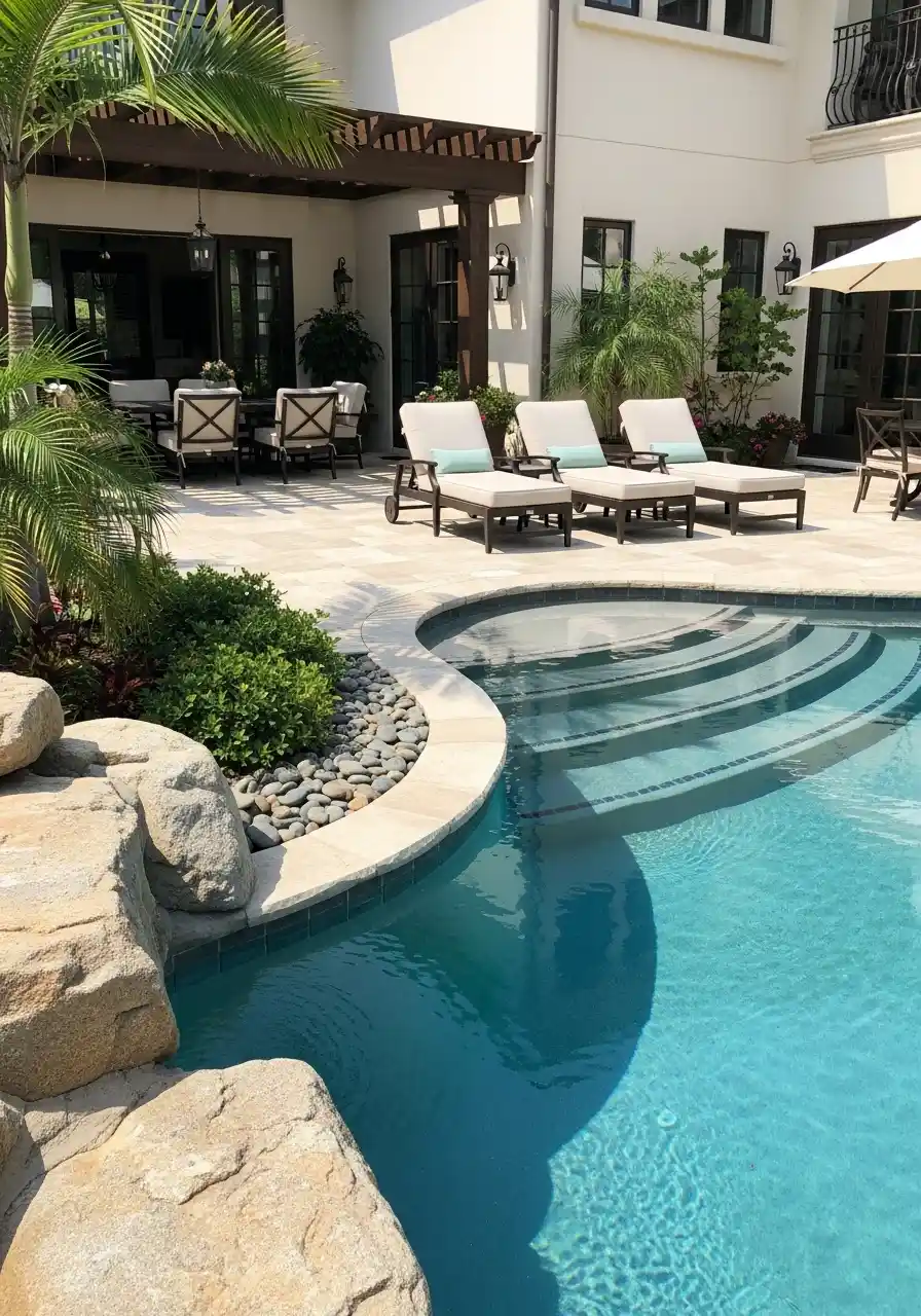 For backyard pool landscaping ideas like this, use a mix of textures: smooth pavers, rounded rocks, and soft plants. But don’t go too wild with colors or it turns into chaos. I’d pick greens plus one accent color, like white flowers. Also, place palms where they won’t drop a million leaves into the pool. I learned that the hard way watching someone skim their pool for like 45 minutes straight.