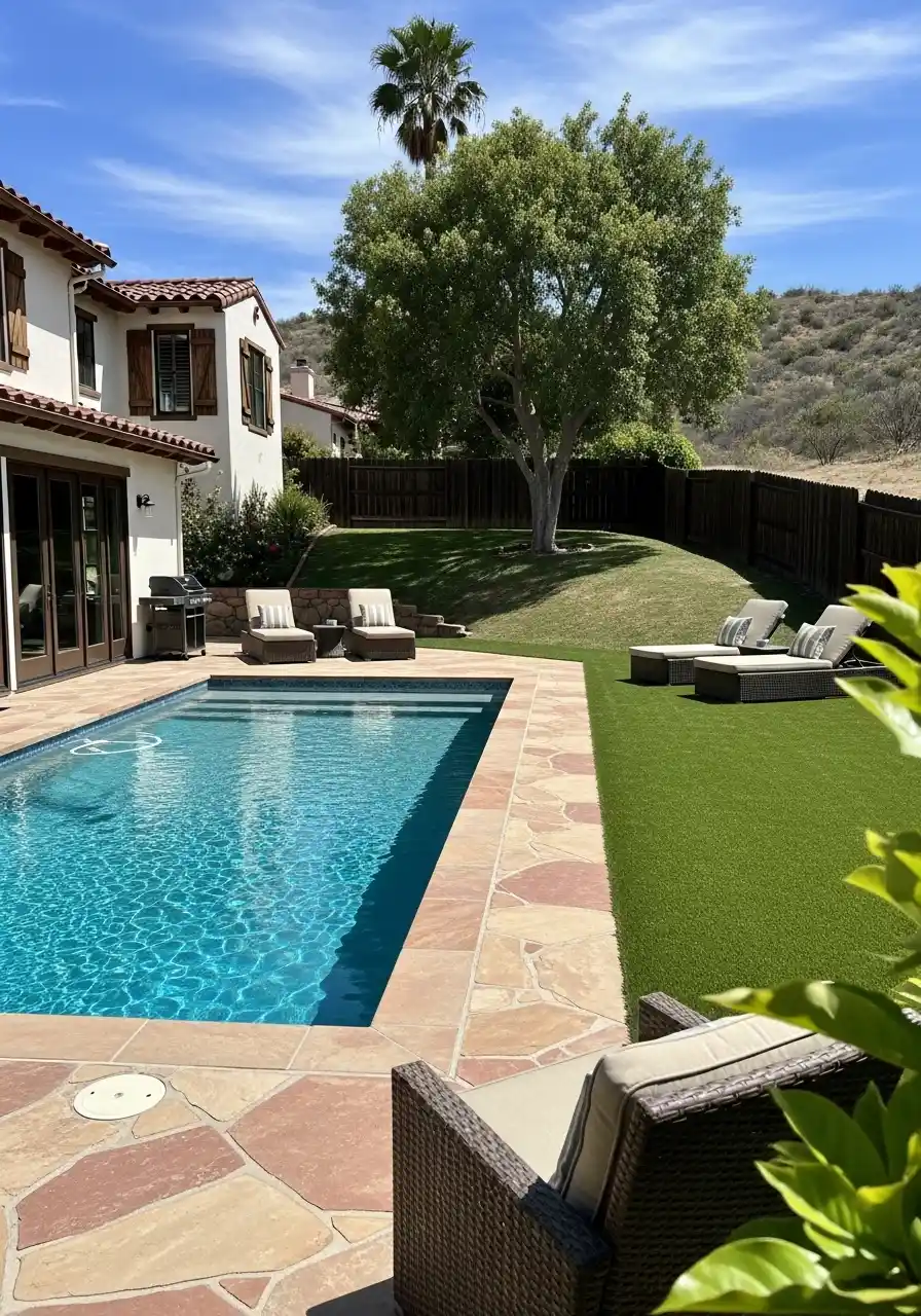 If you want backyard pool landscaping with a lawn focus, you have to keep the grass healthy or it looks sad fast. Use stepping stones or a small path so people aren’t wearing a dirt trail into the lawn. Also, keep the pool decking wide enough for loungers so nobody drags chairs across the grass. And I’d add a low retaining edge on the slope to stop erosion. Slopes + pools can get messy if water runs the wrong way.