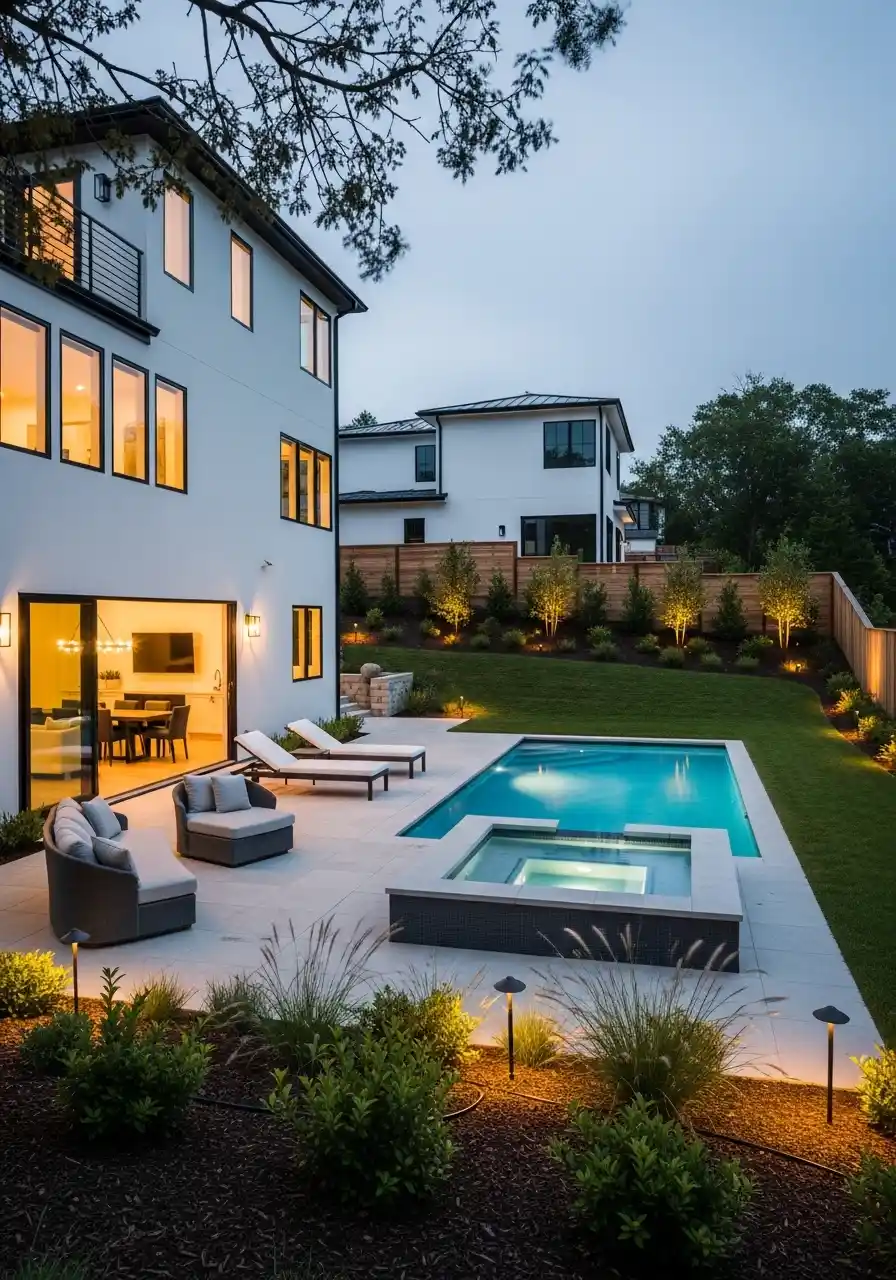 Backyard pool landscaping with modern lines, a spa, and evening lighting