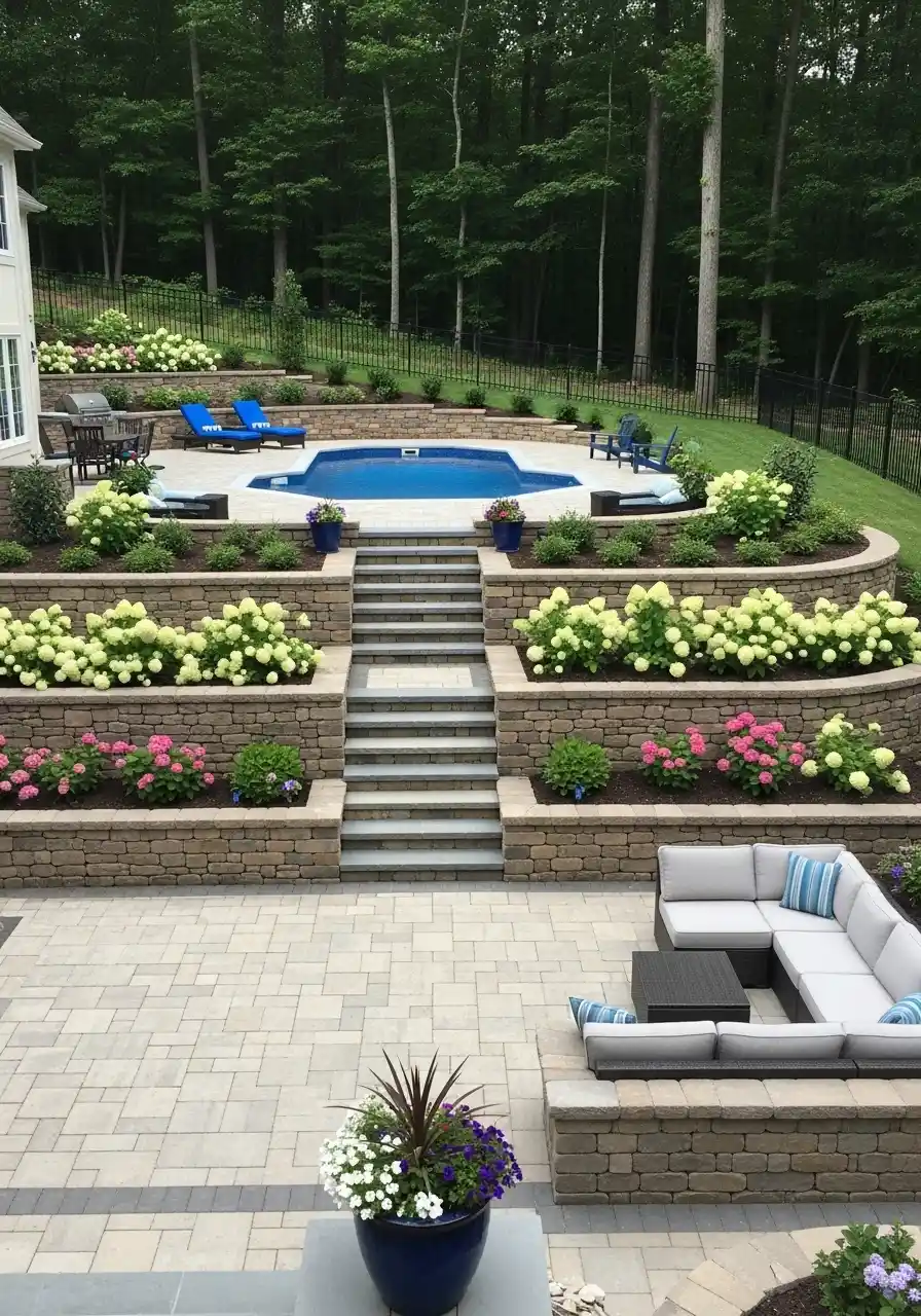 Backyard pool landscaping with stacked terraces and hydrangea layers