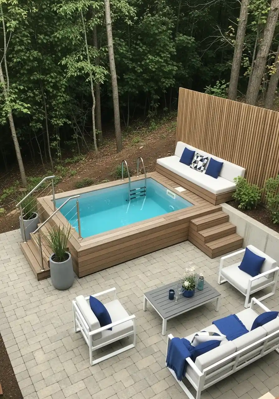 This little plunge pool setup is so smart for smaller yards. The raised pool edge, the built-in steps, and the big bench seating make it feel like a tiny backyard spa. The privacy wall is huge too, because it blocks the woods and makes the space feel like its own room.