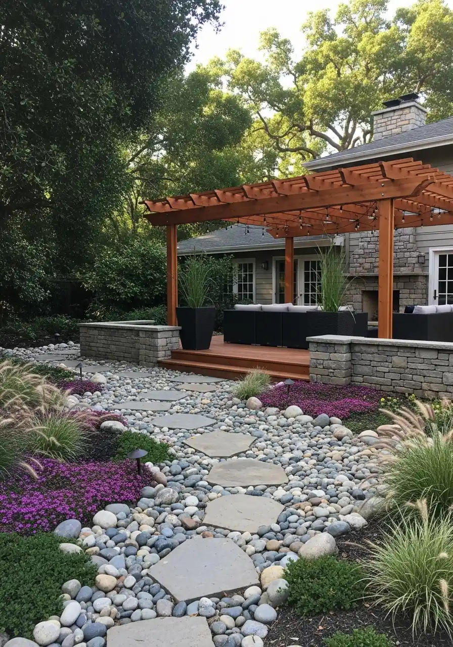 This next scene is a whole vibe. A river rock “dry creek” path with big stepping stones leading right to a pergola lounge. The wood pergola feels warm, the stone walls feel sturdy, and the whole thing looks like it belongs in a calm neighborhood where people somehow always have clean windows. This is california backyard landscaping that looks fancy but still relaxed.