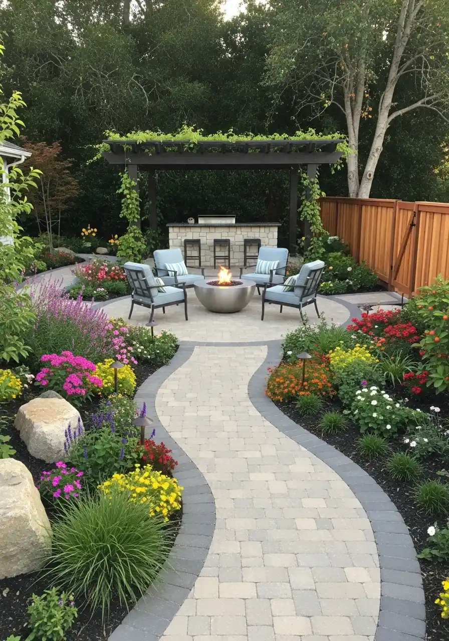 This one feels like a backyard that actually gets used. A curved paver walkway leading to a round seating area with a fire bowl, plus a pergola bar in the back. The curve makes it feel welcoming, like it’s pulling you in. And the flowers on both sides are loud in the best way. This is california backyard landscaping that feels happy and social.