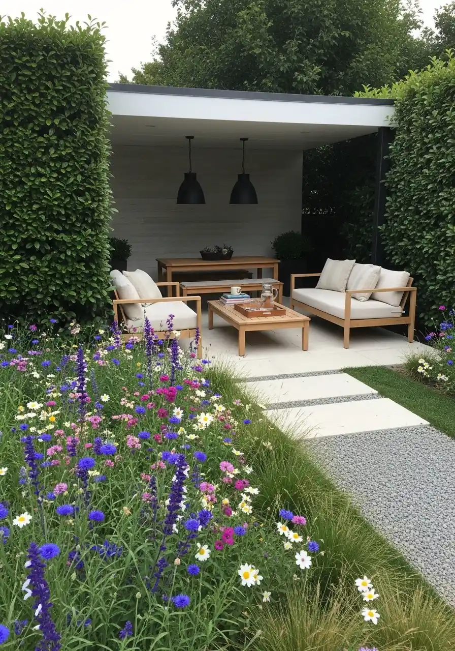 If you want this look, you need strong structure first. That means hedges or tall screening plants that are trimmed neatly. It does take effort, not gonna lie. But the payoff is huge because it makes the patio feel like a real room. Keep the furniture wood-toned and neutral so the greens stand out.