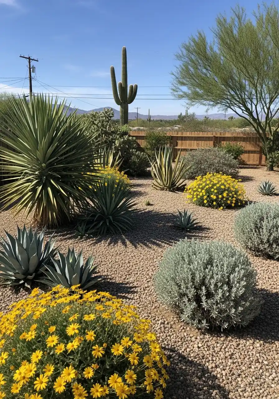 One trick: group plants in odd numbers. Three agaves looks better than two. Five small succulents looks better than four. I don’t know why, but it’s true. Also, add a few bright flowers for contrast, like yellow desert blooms. It makes the yard feel alive, not dusty.