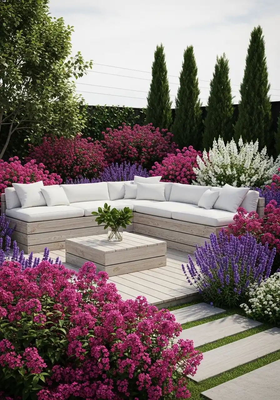 This second yard feels like a designer did it, not a “weekend project.” There’s a slightly sunken patio with steps, a big corner sofa, and that clean row of trees behind it like a green wall. Then the planting in front is bold: purple spikes, bright pink drifts, and round green shrubs that look like little gumdrops.
