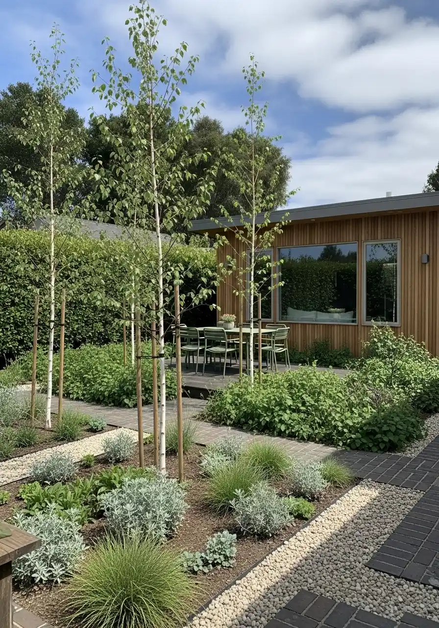 This one feels modern but not cold. A clean grid of pavers and gravel bands, with young trees and soft shrubs. It’s the kind of yard that looks organized without feeling stiff. I like it because it feels walkable. Like you can actually move through the yard instead of just staring at it.