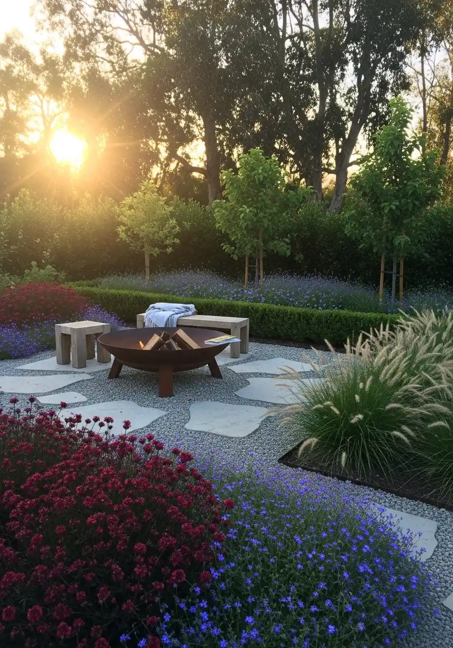One important thing: add wind protection if you can, like a hedge line or tall shrubs. Wind plus fire pit can get sketchy fast. Safety first, even when you’re trying to be cozy.