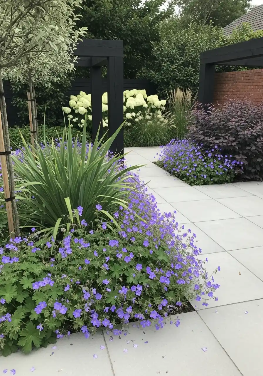 This one is modern, but still soft. The big pavers are clean and pale, the black frames feel architectural, and the plants are mostly in cool tones. There’s a spiky plant (looks like yucca or phormium), a dreamy blue-purple groundcover spilling over the edge, and those big white hydrangea puffs again.